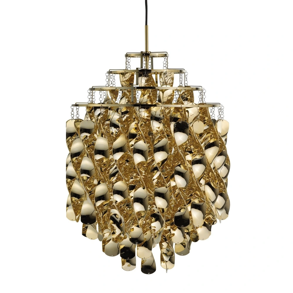 Design Verner Panton 1969. Hienon valaisimen muoviset roikkuvat spiraalit heijastavat valoa ympäristöön.